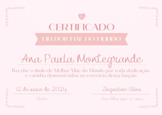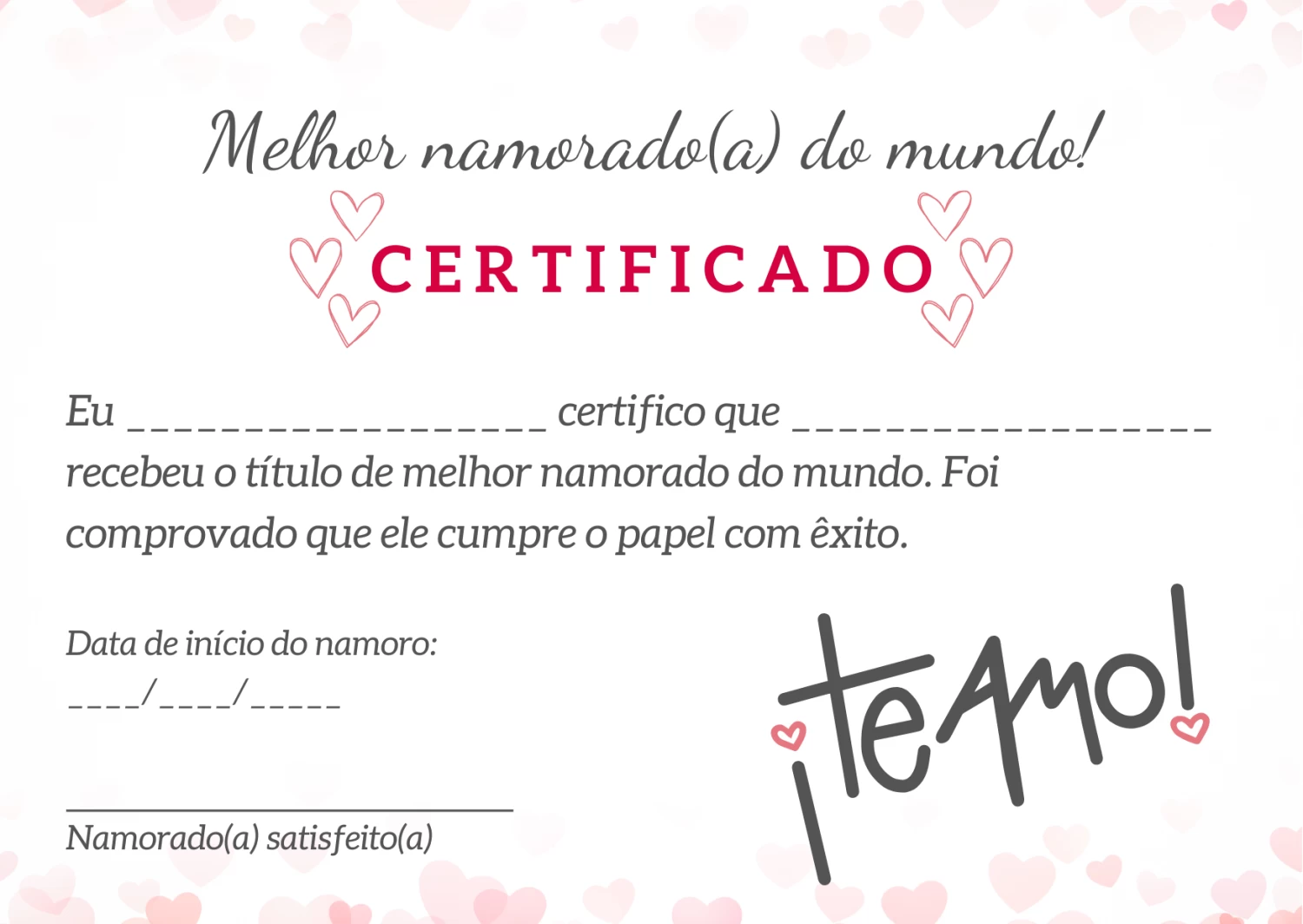 O certificado “Melhor Namorado(a) do Mundo” é uma lembrança divertida e afetiva, perfeita para o Dia dos Namorados, aniversários de namoro ou para presentear sem data marcada.