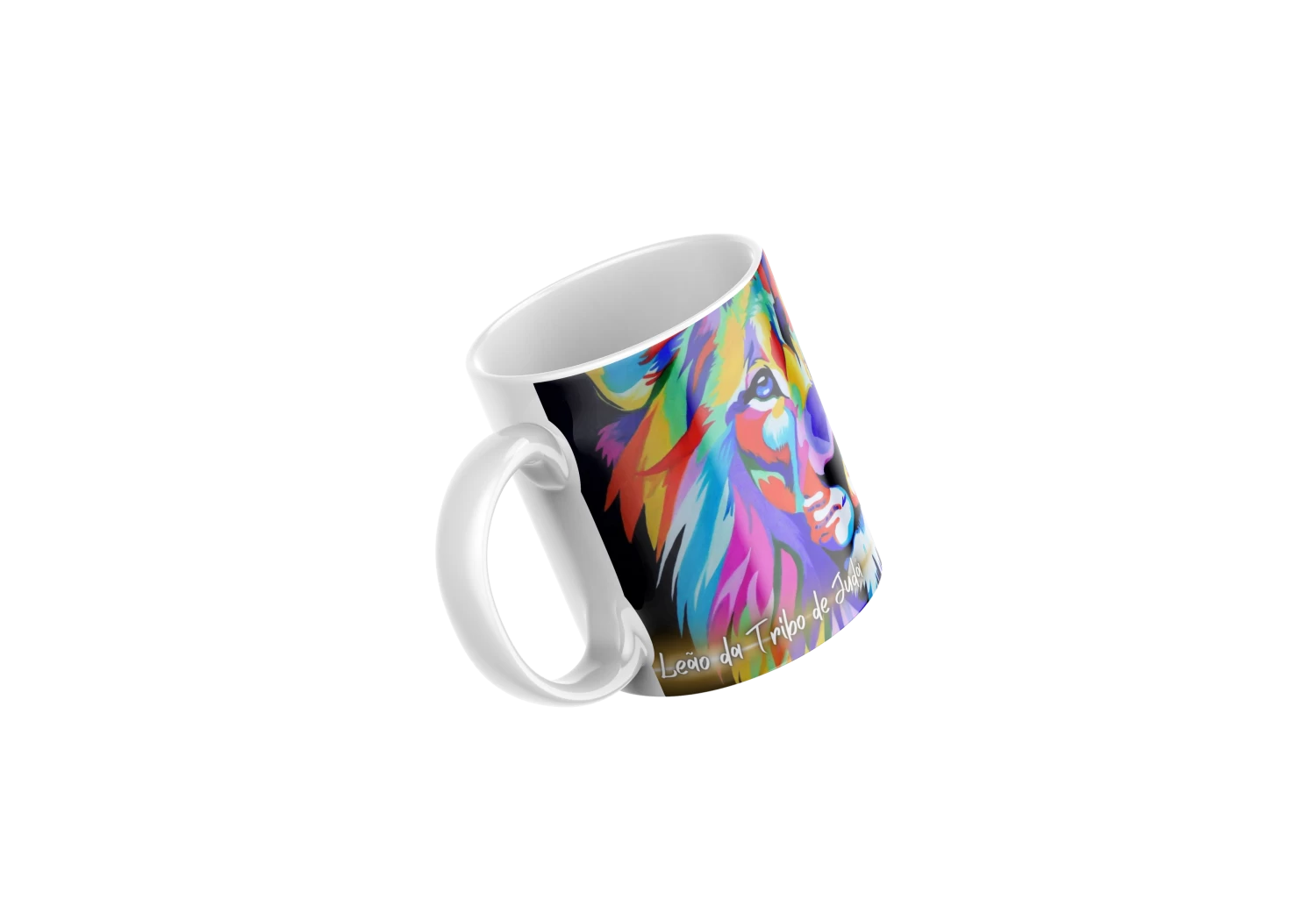 Caneca personalizada com a arte do Leão da Tribo de Judá, símbolo de força e fé, perfeita para quem deseja expressar sua crença no dia a dia.