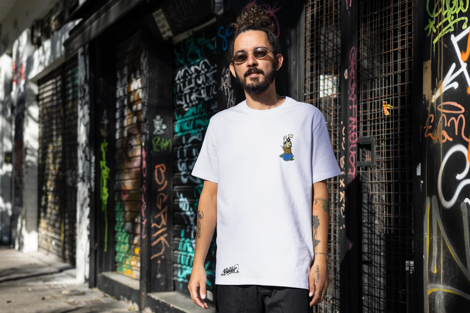 Vista a originalidade e a cultura local com a coleção exclusiva de camisetas assinada por Buche, artista de Peruíbe-SP. Cada peça traz estampas autênticas que refletem a essência do litoral, a identidade urbana e a criatividade única desse talento regional.
