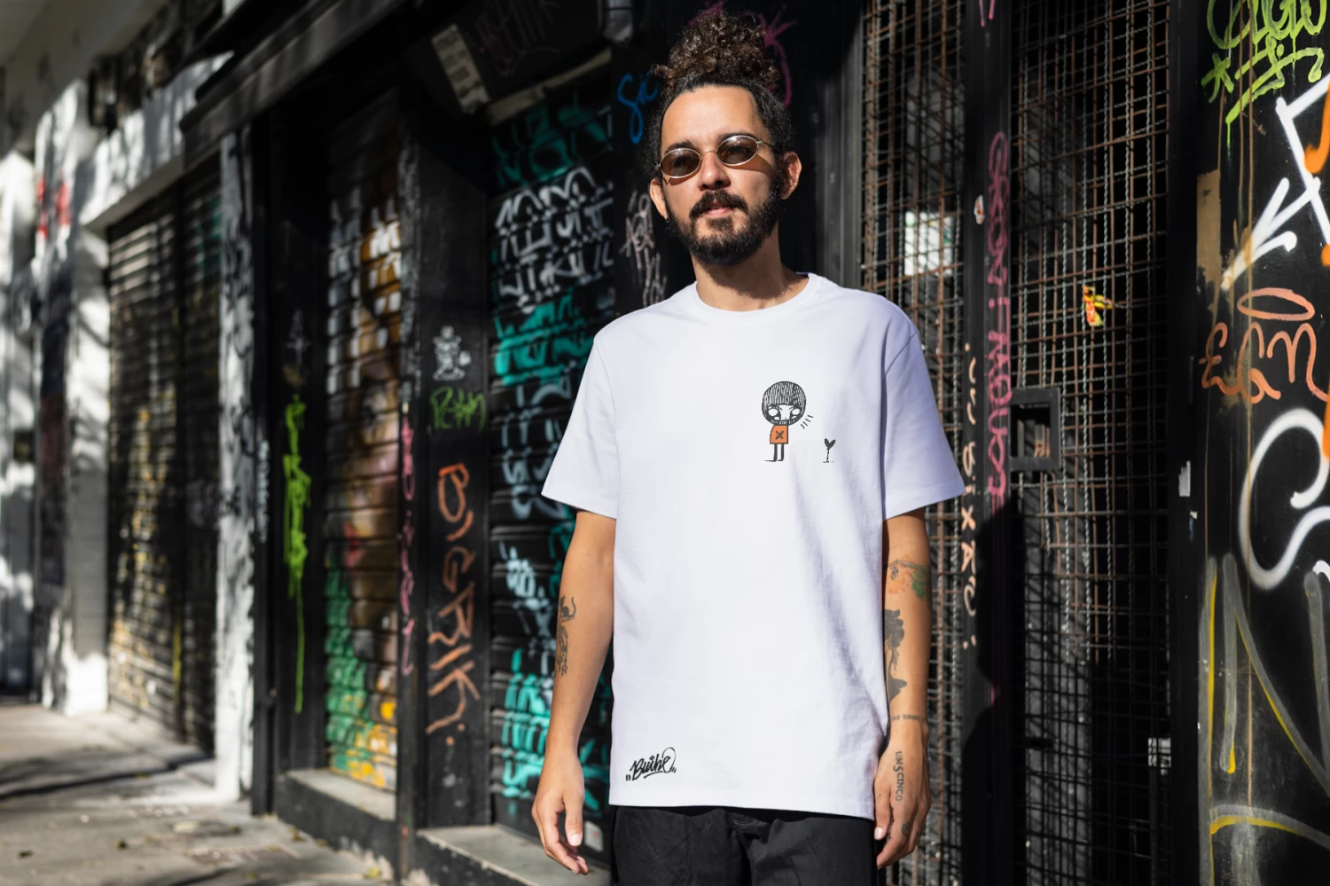 Vista a originalidade e a cultura local com a coleção exclusiva de camisetas assinada por Buche, artista de Peruíbe-SP. Cada peça traz estampas autênticas que refletem a essência do litoral, a identidade urbana e a criatividade única desse talento regional.
